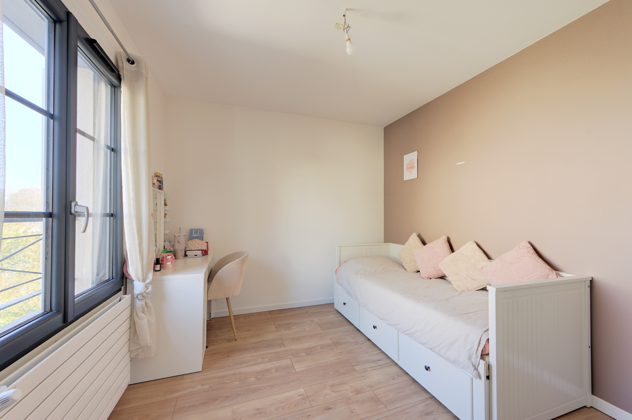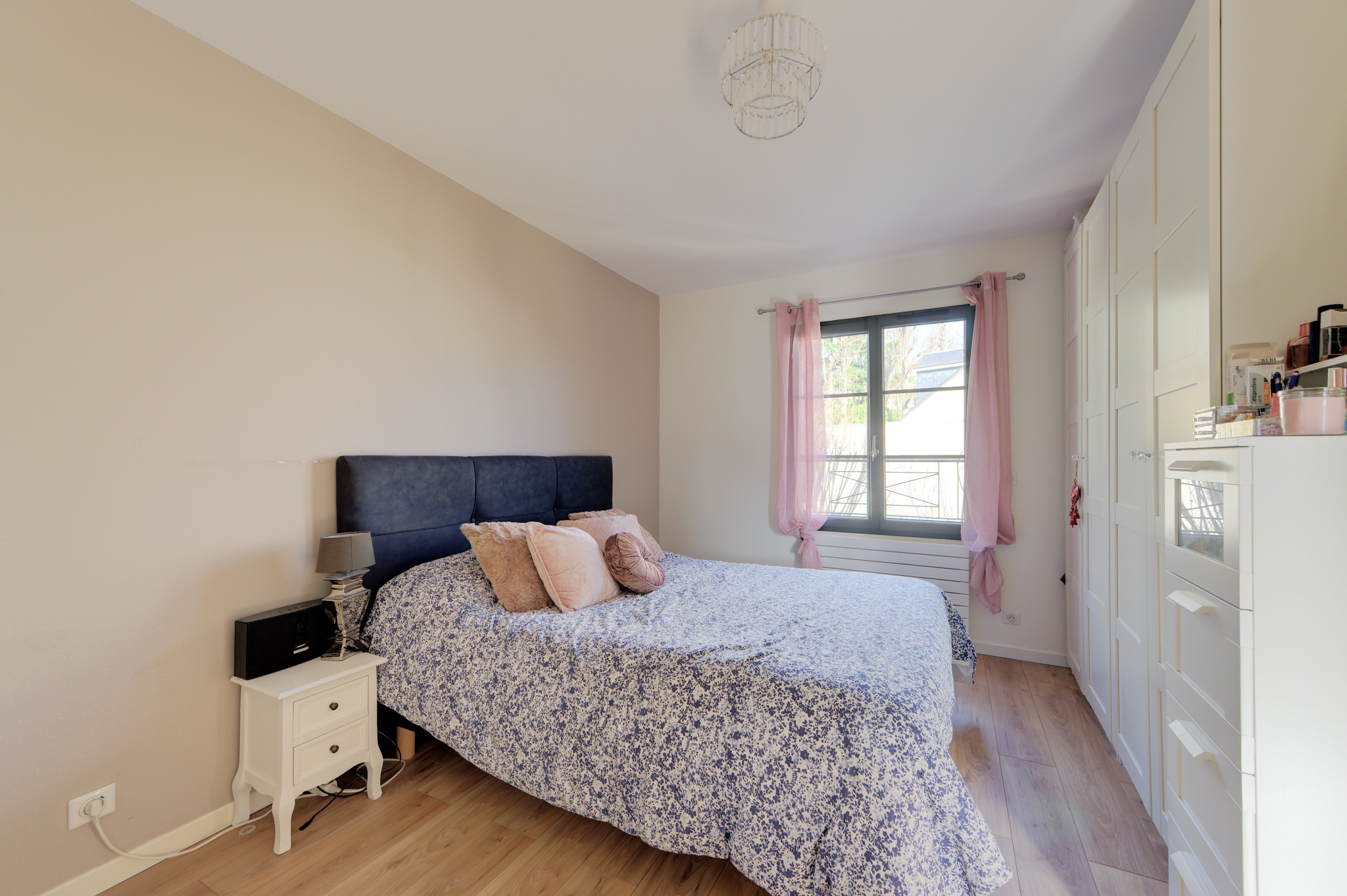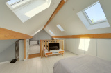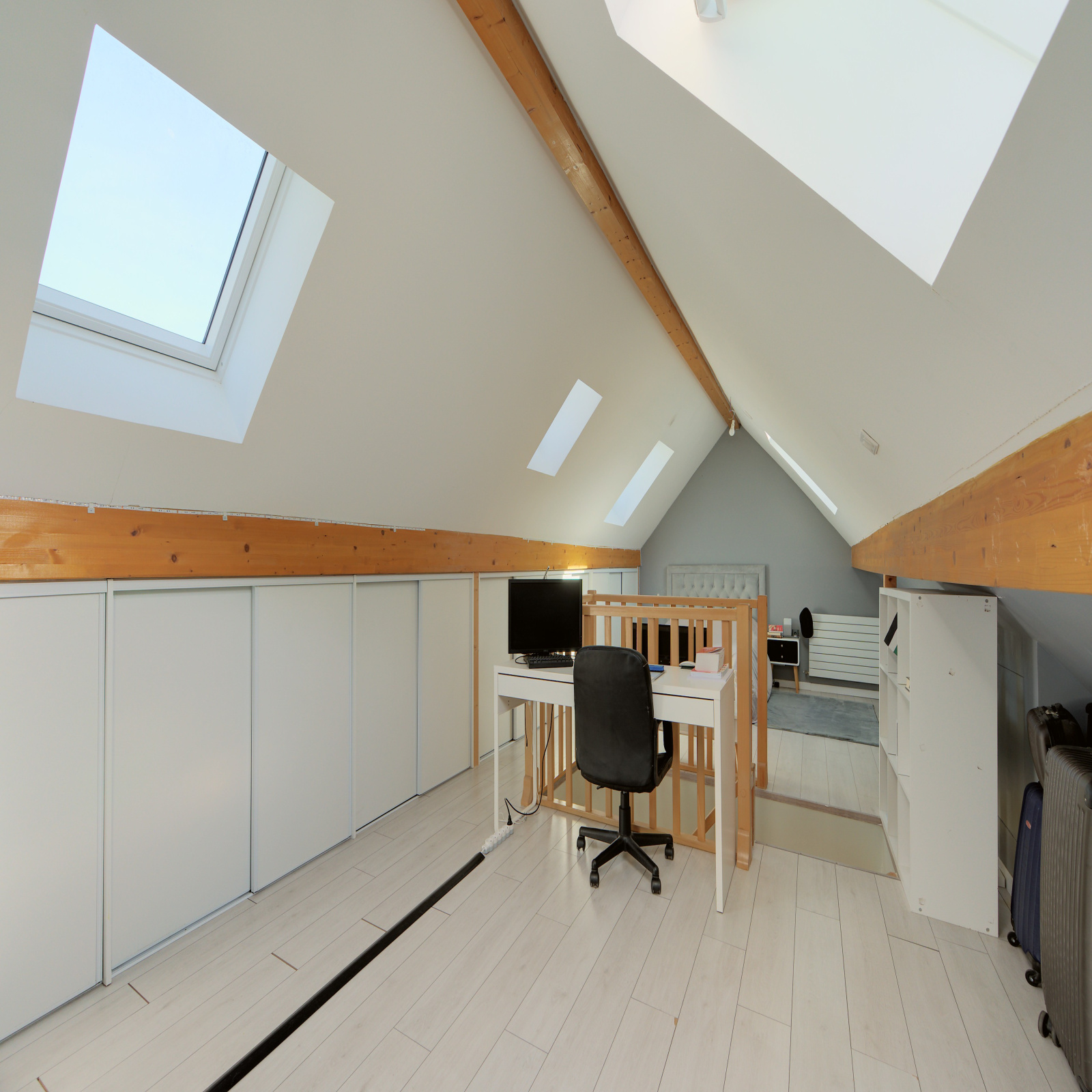 Deuxième étage : Les combles ont été aménagés en une grande chambre sous mansarde, avec une optimisation soignée des espaces de rangement, offrant ainsi une pièce à la fois pratique et agréable.
