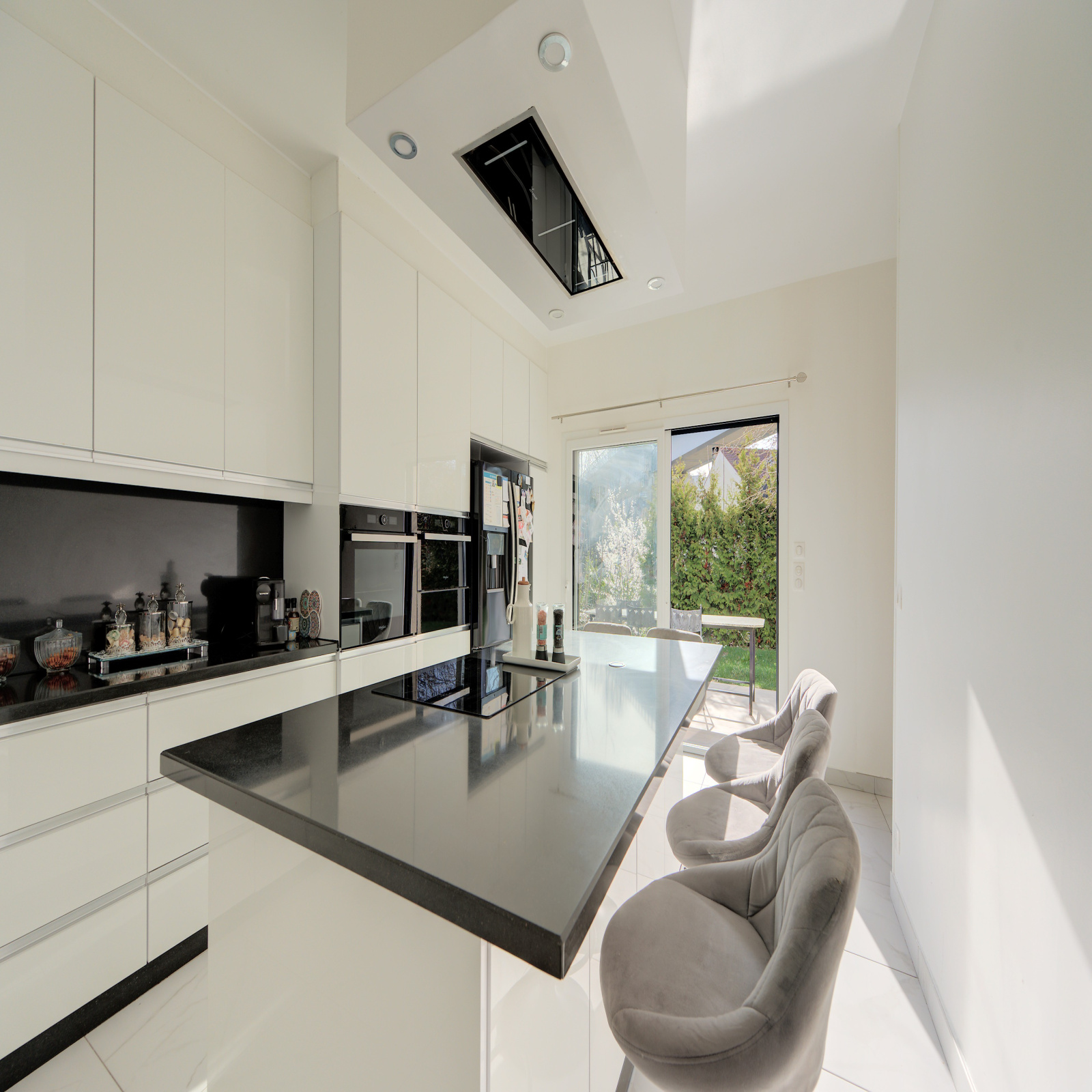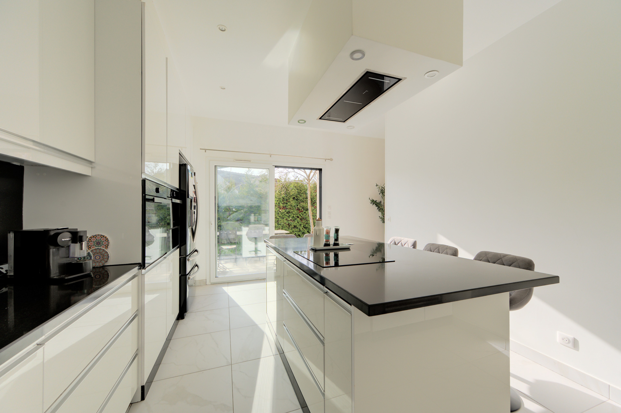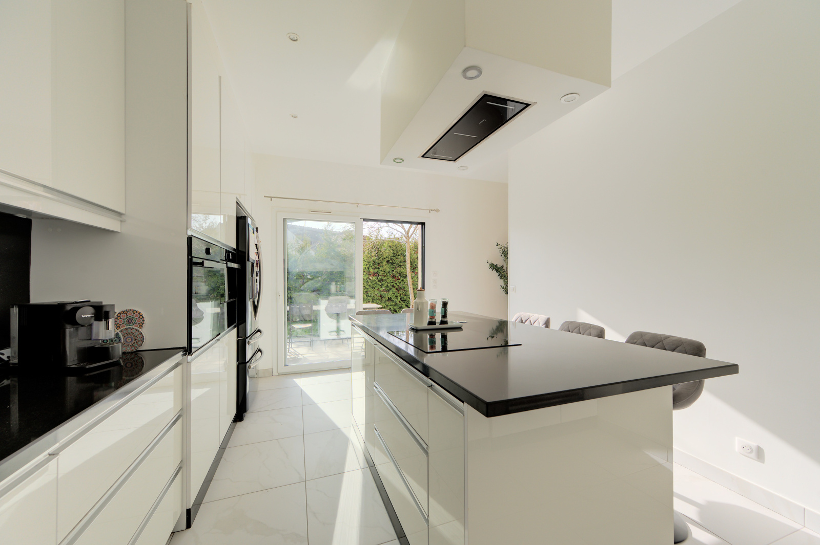 Rez-de-jardin (niveau -1) : Un vaste double séjour lumineux, agrémenté d'un poêle, s'ouvre sur une cuisine américaine moderne et fonctionnelle. Ce niveau bénéficie d'un jardin privatif sans vis-à-vis, avec terrasses, offrant un cadre paisible et intime. Un local technique complète également ce bien.